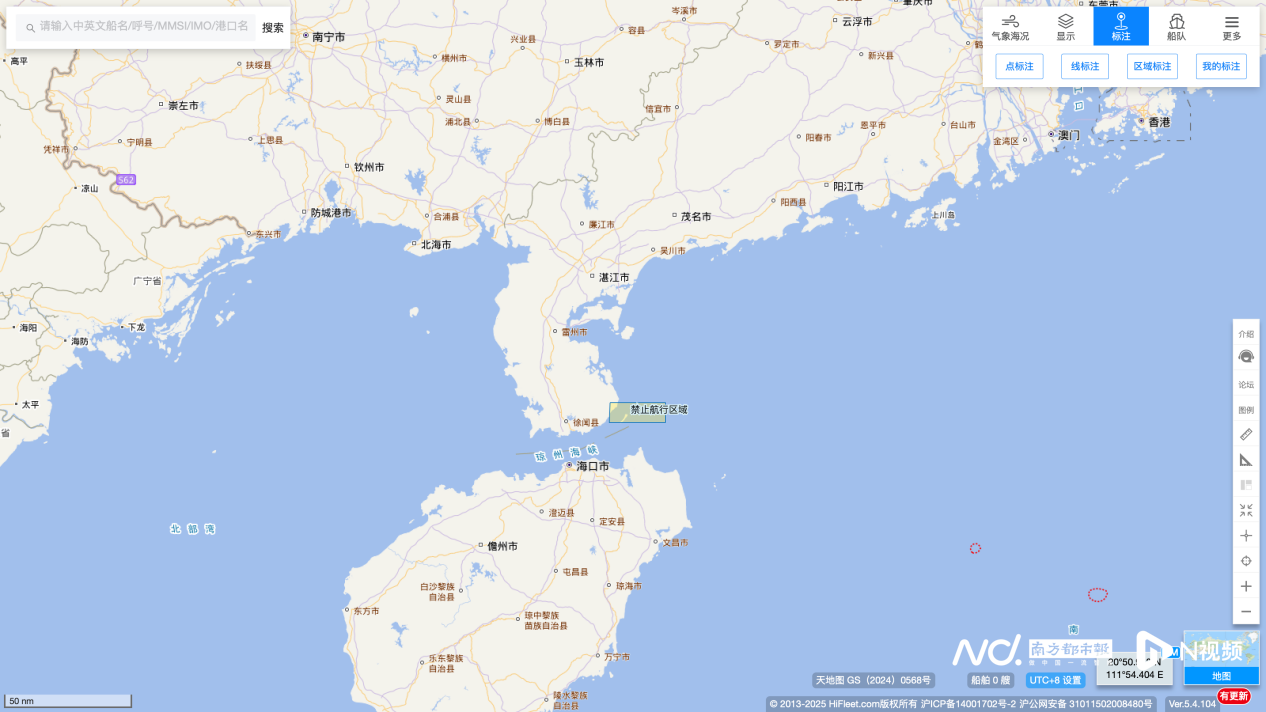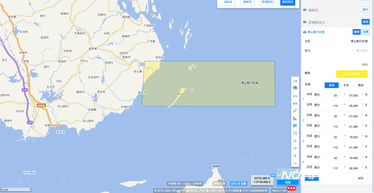 该区域位于海南岛以东的南海海域,船只飞翔至该区域近邻时,应仔细查对导航建造,确保隔离以上坐标点连成的边界。